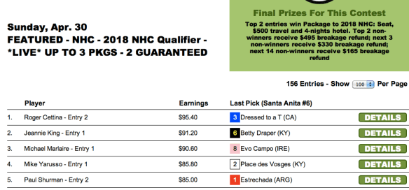 Basil’s son Alex was poised for a seat heading into the final race, but Steve Arrison (winner of an NHC seat the previous Saturday at HorseTourneys) snuck past him to claim one of the two big prizes along with Christopher Fischer.