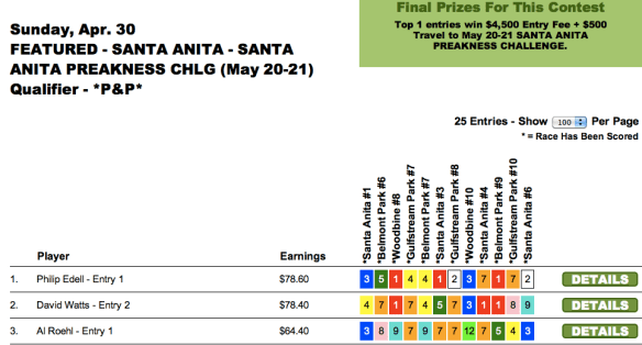 On Sunday, Philip Edell finished first over David Watts by a mere 20 cents, and that 20-cent difference earned Philip a $5,000 package ($4,500 entry plus $500 travel) to the Santa Anita Preakness Challenge.