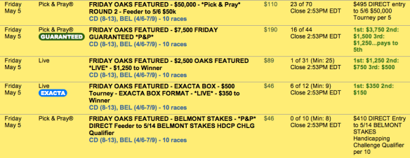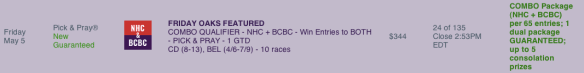 Our major competition of the day is over at HorsePlayers where we’ll be hosting our second big NHC/BCBC Combo qualifier. Win this Pick & Pray and you win a seat to both! Win this and your Kentucky Derby day may seem anti-climactic even if you hit the Derby Superfecta. It’s $344 to play and one (double) prize is guaranteed regardless of participation. Contest races for this and our other featured Friday tourneys are the 8th through 13th at Churchill and the 4th, 6th, 7th and 9th from Belmont. Sign ups close at 2:53 pm ET.