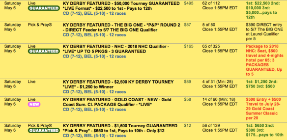 We hope you have plenty of energy (and money) left by Sunday, because there are many worthwhile tourneys to play. Why not take some shots at a time when much of the competition is experiencing a Derby hangover?
