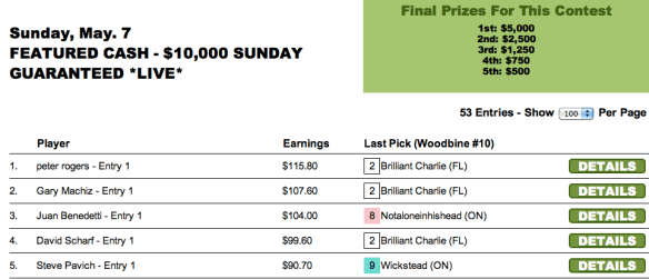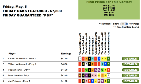 Derby weekend was rounded out, of course, by our $1,500 Guaranteed Exacta box game. Last week’s winner, Sean O’Malley, had another strong showing…