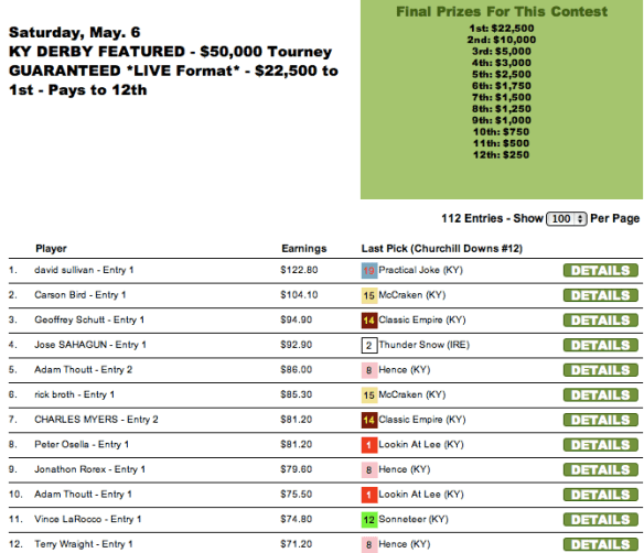We are very confident that David Sullivan will forever connect Derby 143 with HorseTourneys. His sharp Derby day selections in our two biggest tournaments earned him identical scores of $122.80—good for the top prizes in both our $50,000 Guaranteed event and our NHC qualifier: