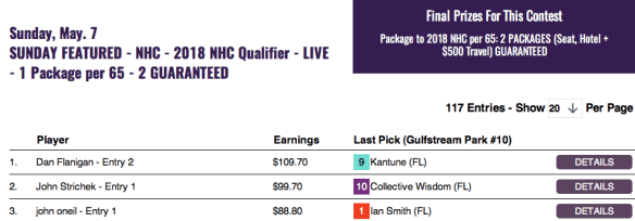 Last but not least, congratulations to Kevin McFarland, who won $282,325 plus an NHC seat and a BCBC entry at the Kentucky Derby Betting Championship. Full standings are available within Sunday’s blog entry.