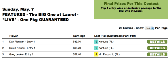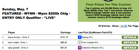 Though Dan didn’t play identical tickets, Heldatgunpoint was also central to his winning Sunday’s NHC qualifier over at HorsePlayers. John Strichek was second and has also now gotten himself qualified to the big dance next February.