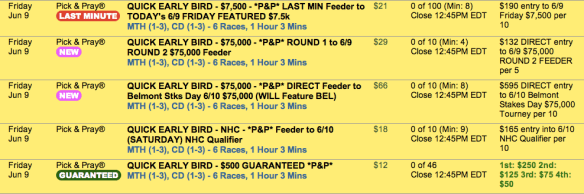 The HorsePlayers feature is extra special—a guaranteed NHC qualifier with an entry fee of just $50. This is a Pick & Pray game with one package awarded per 200 entries but at least two packages awarded no matter what. Contest races are the 7th and 9th from Churchill Downs, the 7th through 11th at Belmont on Belmont Stakes eve; and the 4th, 6th and 7th from Santa Anita.