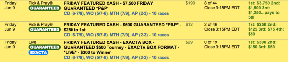 For cash game specialists, there’s also our regular Friday $7,500 Guaranteed event with $3,750 to the winner and payouts down to fifth place. Entry is $190 with a limit of 44 entrants. Contest races are the 6th, 7th and 9th from Churchill Downs; the 5th, 7th and 8th from Woodbine; the 7th and 9th from Monmouth; and the 2nd and 3rd from Arlington—10 races in all.
