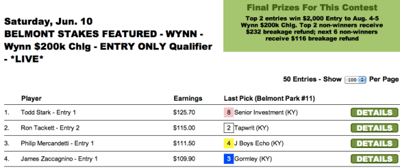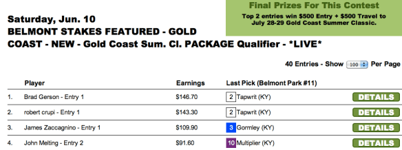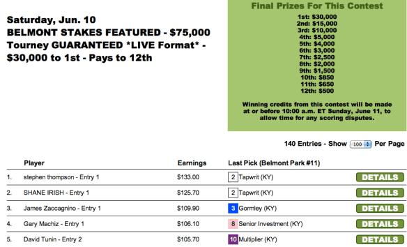 It may not have been the greatest Belmont Stakes of all time. But from purely a tournament perspective, it was a pretty darned good renewal with its large, hard-to-separate field and no scary looking favorite. It was a terrific race to serve as the climax of a lucrative bunch of contests—especially for our $75,000 Guaranteed tourney.