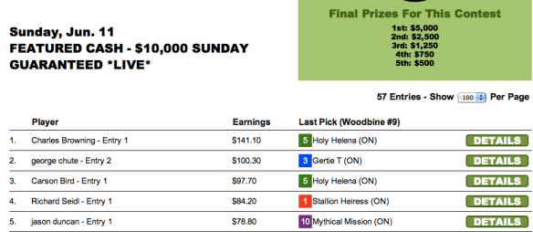 Safe to say Chris Pomerleau’s score of $163.90 would have won just about any Sunday tournament with the exception of Michael Kavana’s NHC win at HorsePlayers. And even there, he would have placed second. And though the races were slightly different, Chris and Phil Johnson would have likely also both done very well in our $10,000 guaranteed game.