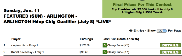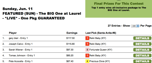 Eric “The Money Man” Moomey parlayed his $350 entry into a $7,500 Del Mar package. If he wins at Del Mar, he will also receive a $10,000 HorseTourneys site credit bonus, which Eric would undoubtedly put to good and strategic use. (It was another frustrating finish on the day for James Zaccagnino, who did very well in several Saturday tourneys but didn’t quite get home in any.) You can join Eric at Del Mar this summer by winning one of our upcoming Del Mar Handicapping Challenge qualifiers. We will now be offering them once a week, rather than every other week. So be on the lookout!