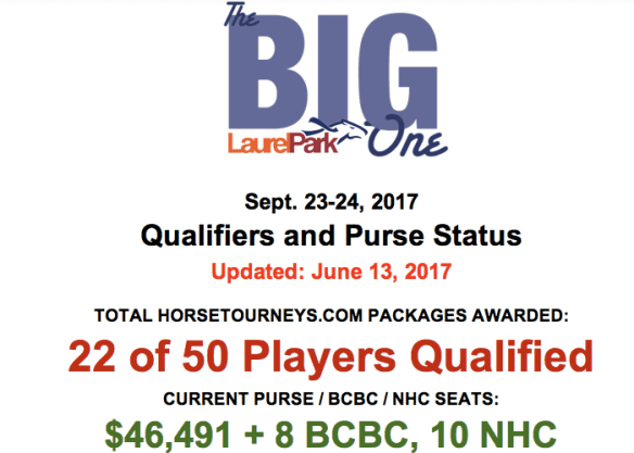 This is a regular page right on the HorseTourneys site. As of June 11, the prize pool was at $46,491, with 28 of 50 players yet to qualify online. So you can count on that number growing significantly between now and September 23. And you can track its progress each week by visiting the above-referenced web page.