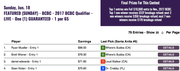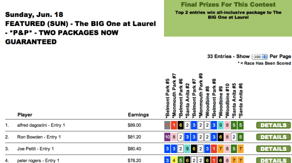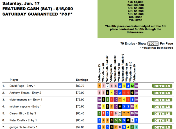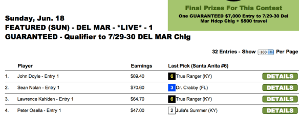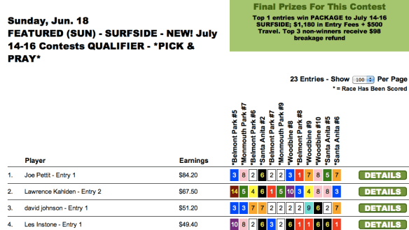 When Belmont ended its Saturday card after three races due to wet conditions, it did a number on our Father’s Day eve featured schedule. Fortunately our weekend schedule was fairly well backloaded to help celebrate the Dads out there. And so there were still a dozen featured tourneys this past weekend—and they showcased a dozen different winners.
