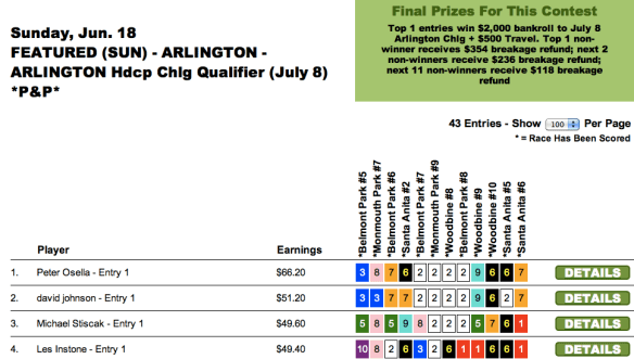 Peter Osella, second in Friday’s $7,500 game and 6th in Saturday’s $15,000 event, was the winner of our Arlington Handicapping Challenge qualifier on Sunday.