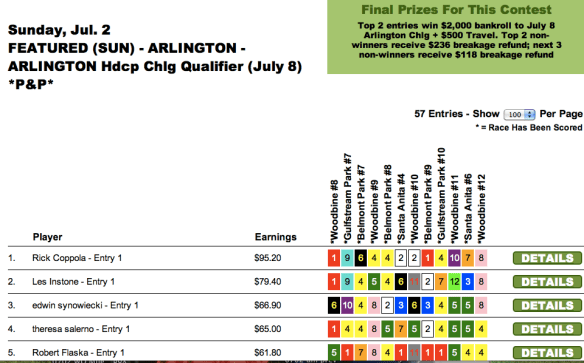 …he can do win/place as well. Here he came in second behind Rick Coppola in our last chance qualifier for next weekend’s Arlington Handicapping Challenge. Rick and Les thus head to beautiful Arlington Park armed with $2,500 packages. They will be two of 14 HorseTourneys qualifiers competing in Arlington Heights.