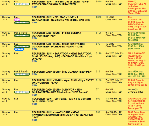 Our first direct qualifier is Sunday, and we’ll have plenty of low-cost, $28 feeders leading into it. The two-day extravaganza at Saratoga (Wednesday and Thursday, August 9-10) will again be operated as two separate, single-day tournaments. The buy-in each day is $1,000 and one Belmont Stakes Handicapping Challenge seat and two NHC seats will be up for grabs each day along with a lot of cash. With the big contest coming up at the Spa in just about a month’s time, opportunities to qualify online will be limited, so sign up now for the feeders and Sunday qualifier. Winners receive their entry fees for both days ($2,000 total) plus $750 in travel–$250 more than normal because, well, it’s Saratoga.