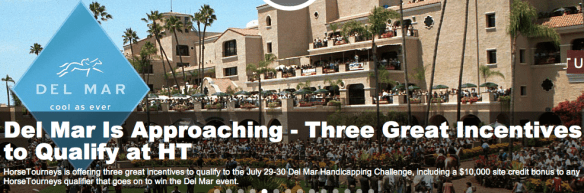 We go the extra mile for Del Mar lovers by attaching a 4% rebate to all of our Del Mar feeders. And, as noted earlier, we guarantee a seat regardless of participation. Last, but far from least, if you win one of our Del Mar qualifiers (as many already have) and then go on to finish first out where the Turf meets the Surf, you will receive a $10,000 HorseTourneys site credit bonus—payable in six monthly installments. Imagine the fun you could have with that credit boost added to your account!