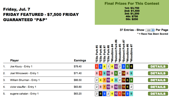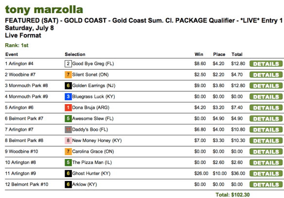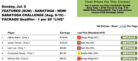 Congratulations also go out to Michael Lynch, Jr. who won the first Hawthorne Summer NHC qualifier of the year on Sunday; to Daniel Kaplan, who won our last-chance Surfside qualifier; and to Brian Johnson, Anthony DeCaspers and George Chute—each of whom won $2,000 entries on Sunday to the August 4-5 Wynn Handicapping Challenge. Remember that we offer Wynn (and guaranteed Del Mar) qualifiers each weekend. So we’ll have more direct qualifiers to both this coming weekend. No need to take a week off here at HorseTourneys!