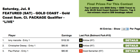 …but that was good enough to earn him the fourth of four Saratoga packages ($1,000 entries for each of the two single-day tournaments on August 9-10 plus $750 travel). Counting the $1,000 Gold Coast package and the $7,500 Del Mar package, Dewey accounted for brick-and-mortar tourney entries totaling $9,500 and travel stipends worth $1,750.