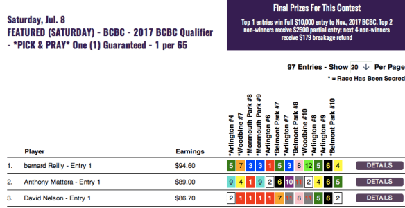 Thanks to solid participation, HorsePlayers was also able to award partial, $2,500 BCBC entries to Anthony Mattera and David Nelson.
