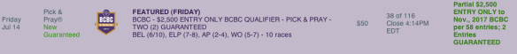 Here at HorseTourneys on Saturday we have our popular $15,000 Guaranteed game (a Pick & Pray this week) with $7,000 to the winner and payouts down to seventh place. Entry is $195 with a limit of 86 entrants. Contest races are the same as for the NHC qualifier at HorsePlayers.