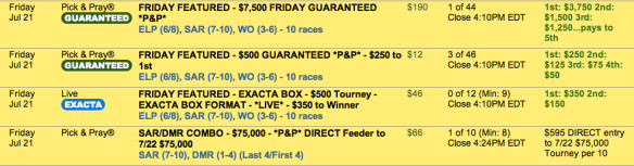We get started in earnest on Friday—opening day at the Spa—with our Friday feature $7,500 Guaranteed Pick & Pray that offers $3,750 to the winner and payouts down to fifth place.