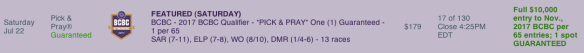 HorseTourneys is always your best (and only) place to qualify for the September 23-24 The BIG One at Laurel where you can play against no more than 56 to grab cash, along with eight full BCBC entries, 10 NHC seats and 10 Horseplayer World Series entries. The entry fee on Sunday for this is $550, and it will be a live-format event.