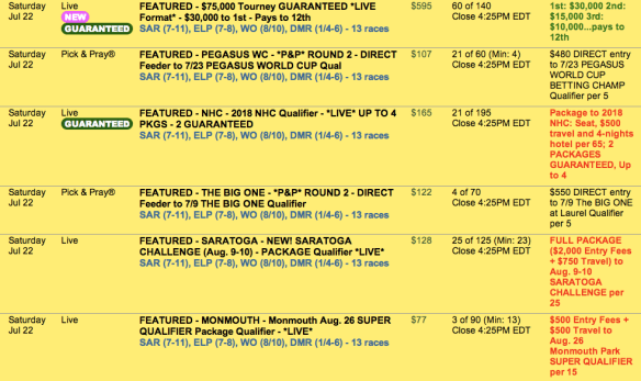 And this week’s $1,500 Guaranteed Saturday Night Live tourney has the added appeal this week of having three Del Mar races in the mix along with action from Lone Star and Evangeline Downs. First race: 8:25 p.m. ET.