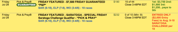 On Saturday we have another Saratoga Challenge qualifier. This one offers a $750 travel stipend in addition to the $2,000 in entry fees for the two single-day tournaments. Entry is $128 with one in 20 earning a $2,750 package. Contest races for this—and for all Saturday featured races are the 6th ,7th , 8th, 9th and 11th from Saratoga; the 7th , 8th and 10th from Woodbine; and the 2nd, 4th, 5th and 6th from Del Mar—12 races in all.