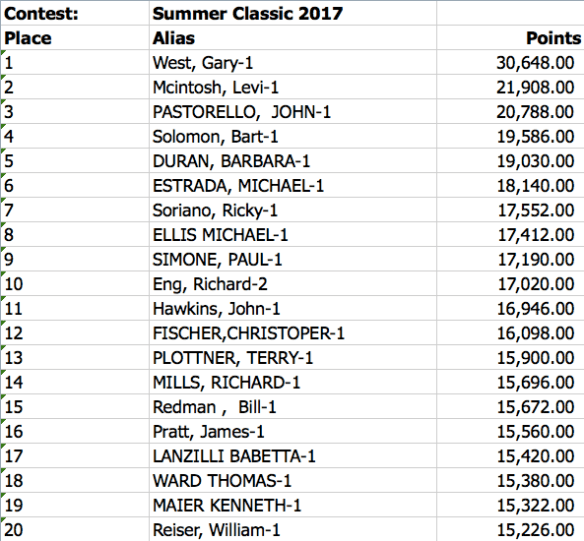 Gold Coast Summer Classic 2017 Top 20 Standings Posted on July 30, 2017 by ericwing Congratulations to Gary West, winner of the 2017 Gold Coast Summer Classic. Here is how the Top 20 finished: Share this: Share on X (Opens in new window) X Share on Facebook (Opens in new window) Facebook Like Loading... Related