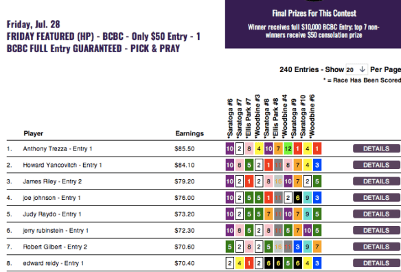 …Michael Sussman emerged with the $10,000 seat, thanks in large part to his picking six of the first eight winners in the 10-race affair. Look for next Saturday’s BCBC qualifier at HorsePlayers to again have a fashionably late start…with the Whitney Stakes from Saratoga.
