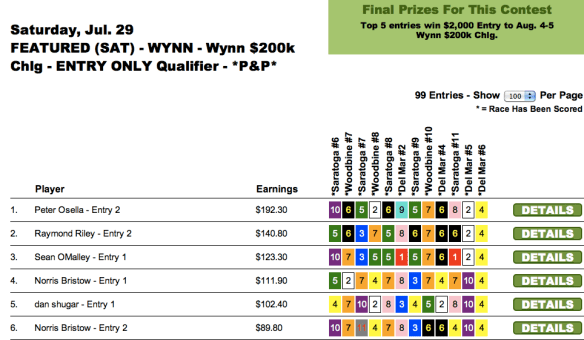 Eleven featured tourneys were offered on Sunday. One of them—the BCBC qualifier at HorsePlayers—intentionally started later in the day with the Haskell as the opening race so as to capitalize on NBC promotion. Indeed the site experienced a noticeable spike in traffic during that 5:00-6:00 p,m. ET window and when the dust settled…