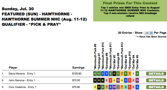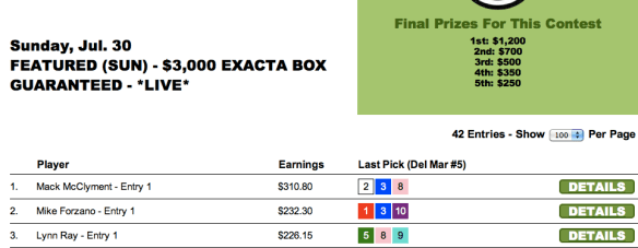 Winner Mark McClyment hit a $1 exacta for $17.30 in the first contest race. He then hit for the remainder of his $310.80 total–$293.50—in the second contest race from Saratoga. He whiffed on his next 10 plays, but it mattered not. Early speed is always dangerous!