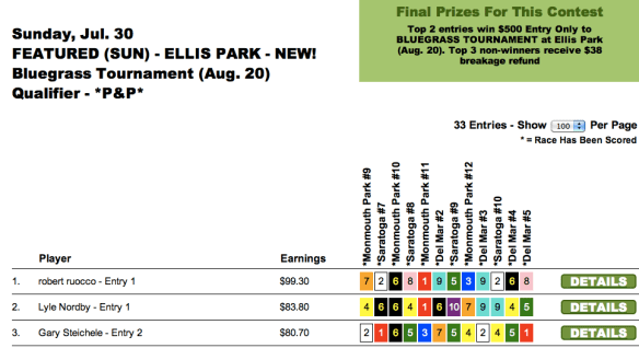 In other Sunday action, Robert Ruocco and Lyle Nordby were the two winners in our Ellis Park Bluegrass Tournament qualifier.