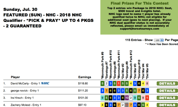 …in that Mike Ferrozzo finished first in both. And the runner-up to Ferrozzo this past Saturday was Robert Gilbert, who finished first in a HorsePlayers NHC qualifier on July 23. Gilbert also finished first in Saturday’s qualifier for the Monmouth NHC Super Qualifier on August 26.