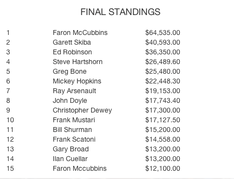 Garett Skiba from Hinsdale, IL, was the 2nd place finisher with a final bankroll of $40,593. He receives $60,000+ in prizes for earnings of more than $100,000.