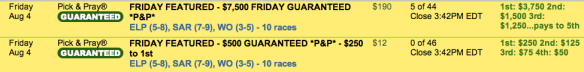 The same races will serve as the race menu for our Friday $7,500 Guaranteed Pick & Pray that offers $3,750 to the winner and payouts down to fifth place.
