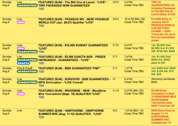 Also of special note is that—yet again—the purse for our Sunday Exacta tourney has been increased. It’s now up to $3,500 Guaranteed with the best three-horse-exacta-box picker earning $1,400. The 2nd, 3rd, 4th and 5th best pickers will also win a cash prize. It seems like just yesterday that this game was worth $1,500 total.