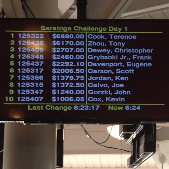 Terence Cook hit a $700 win bet on last race winner Fairybrook ($8.80) to move ahead of Tony Zhou and collect the top prize of $17,550–plus live bankroll winnings of $6,170–in today’s first day of the Saratoga Challenge.