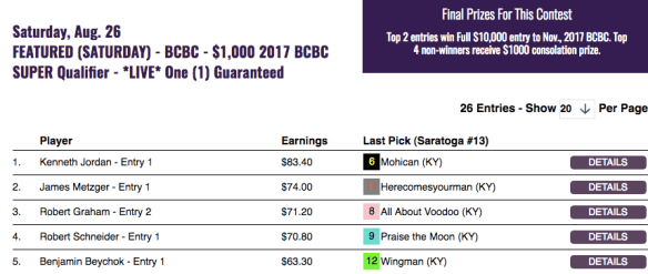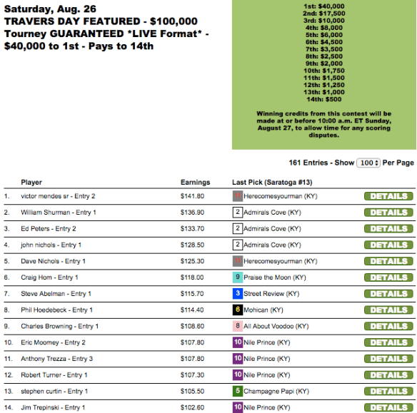 Interestingly, none of the top 16 in the standings heading into the last race had the winner (Mohican) or the runner up in the final race (the 13th from Saratoga). That was good news for Mendes and most of the other cashers.
