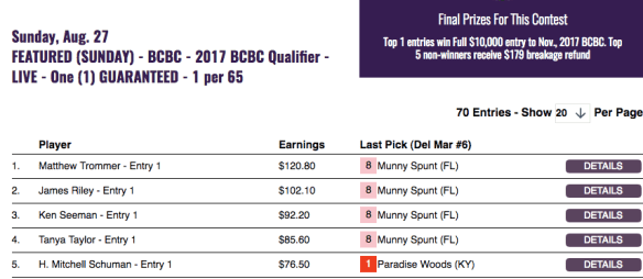 And good money it was–$10,000 entries to the Breeders’ Cup Betting Challenge in Sunday’s low-ratio qualifier.