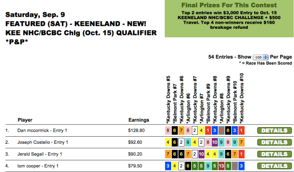 Anthony “The ATM” Mattera blitzed the field in the $1,000 BCBC Super Qualifier with the highest score of the day–$131.40. Mattera collected in eight of 12 races, including six winners paying between $5.40-$20.60. Playing the role of Sham was Brian Chenvert. But shed no tears for Brian. In addition to winning this BCBC seat for the second-place finish, he earned an NHC seat on Friday in a live tourney at Canterbury Park. Not a bad weekend’s work.