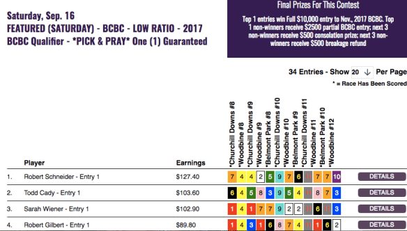In our $500 Low Ratio qualifier, Robert Schneider was a convincing winner and runner up Todd Cody won a partial ($2,500) entry. Schneider hopes to “make a copy” of that finish come Breeders’ Cup time.
