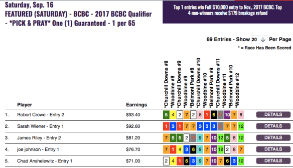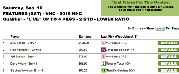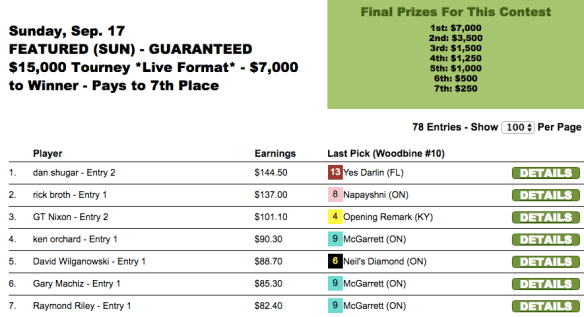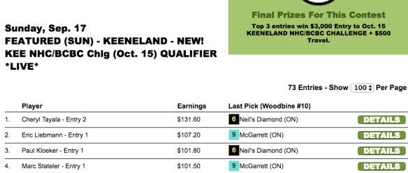 Sunday was, as usual, the busiest day of the weekend with several featured tourneys n addition to our final 2017 qualifier for The BIG One and our $15,000 game. Two of our featured-contest winners were Brett Wiener and James Henry. And both used cap horse winner McGarrett (#9 in Woodbine race 10) in the final race of their respective tourneys to claim victory.