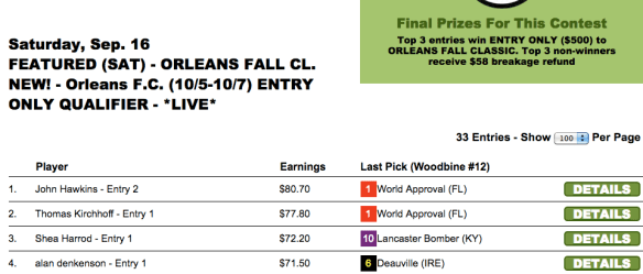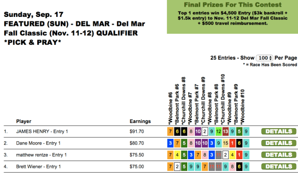 Congratulations to the always-formidable Joe Pettit of Charleston, S.C. on his $12,500 hit. Joe Johnson, was second. And he was also second–and third!–behind Dan Shugar in the September 9 $25,000 game. And note that two-time Eclipse Award-winning owner Richard Englander checked in fourth.