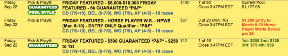 Using the same races, we’ll also host a Horse Player World Series entry-only qualifier (one of two during the weekend) for $87 with one in 20 coming out of this Pick & Pray with a $1,500 entry for next March.
