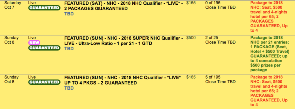 During this weekend, and each of the four weekends in October, we’ll be offering plenty of the traditional 2-seat-guaranteed qualifiers for $165. But those who prefer to play for higher entry fees in exchange for a better chance at a reward will have several chances to take part in our (relatively) new NHC Super Qualifiers which carry an attractive winning ratio of 1 in just 21. We plan to offer a Super Qualifier each Sunday in October.