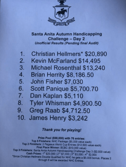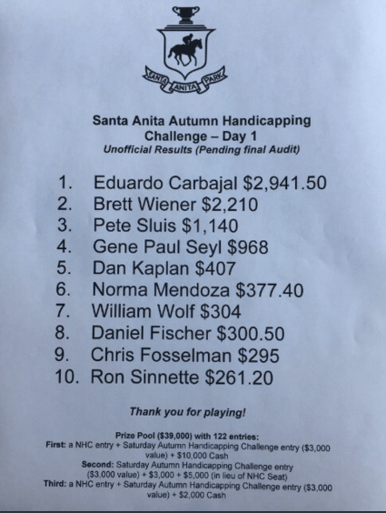 Courtesy of Santa Anita Park, here are the daily top 10 leaderboards from each day of last weekend’s three-day Santa Anita Autumn Handicapping Challenge. Congratulations to daily winners Eduardo Carbajal (Friday), Christian Hellmers (Saturday) and Robert Talstra (Sunday).