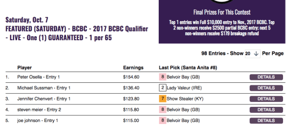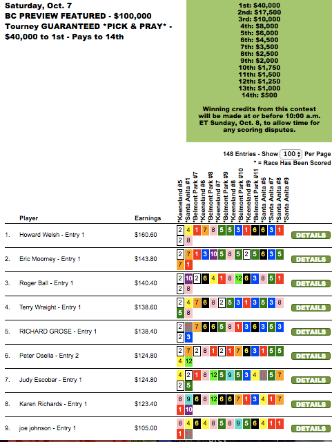 But he sprinkled in four place horses that grew his bankroll just enough to garner a $10,000 entry in Sunday’s Low Ratio BCBC qualifier. Congratulations to Joseph Wenzel and writer extraordinaire Dick Jerardi who each won $2,500 partial BCBC entries.