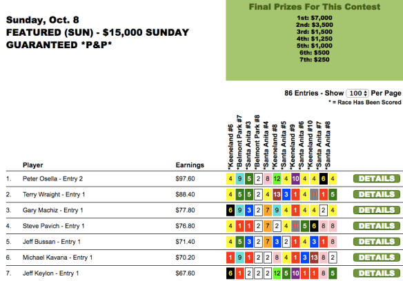 Not bad! Diaz had three wins and three places, but it was Vegas Vic ($7.80, $4.60) in the next-to-last contest race (the 7th at Santa Anita) that put him over the top.