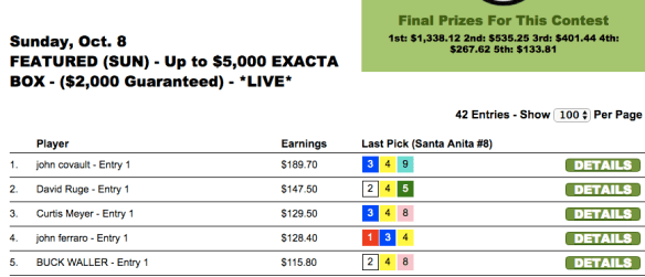 …and that got him first money of $1,338.12 in Sunday’s $2,000 Guaranteed Exacta Tourney that finished with a total pot of $2,776.