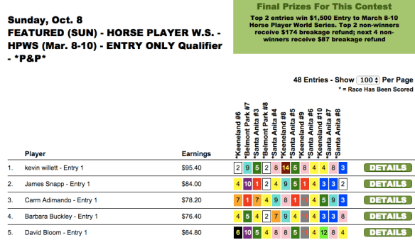 When Papa Turf won and paid $15.00 to win and $8.00 to place it propelled Willett from 4th place to 1st place, earning him the $1,500 entry to the Orleans extravaganza. James Snapp held second to snag the other $1,500 prize.